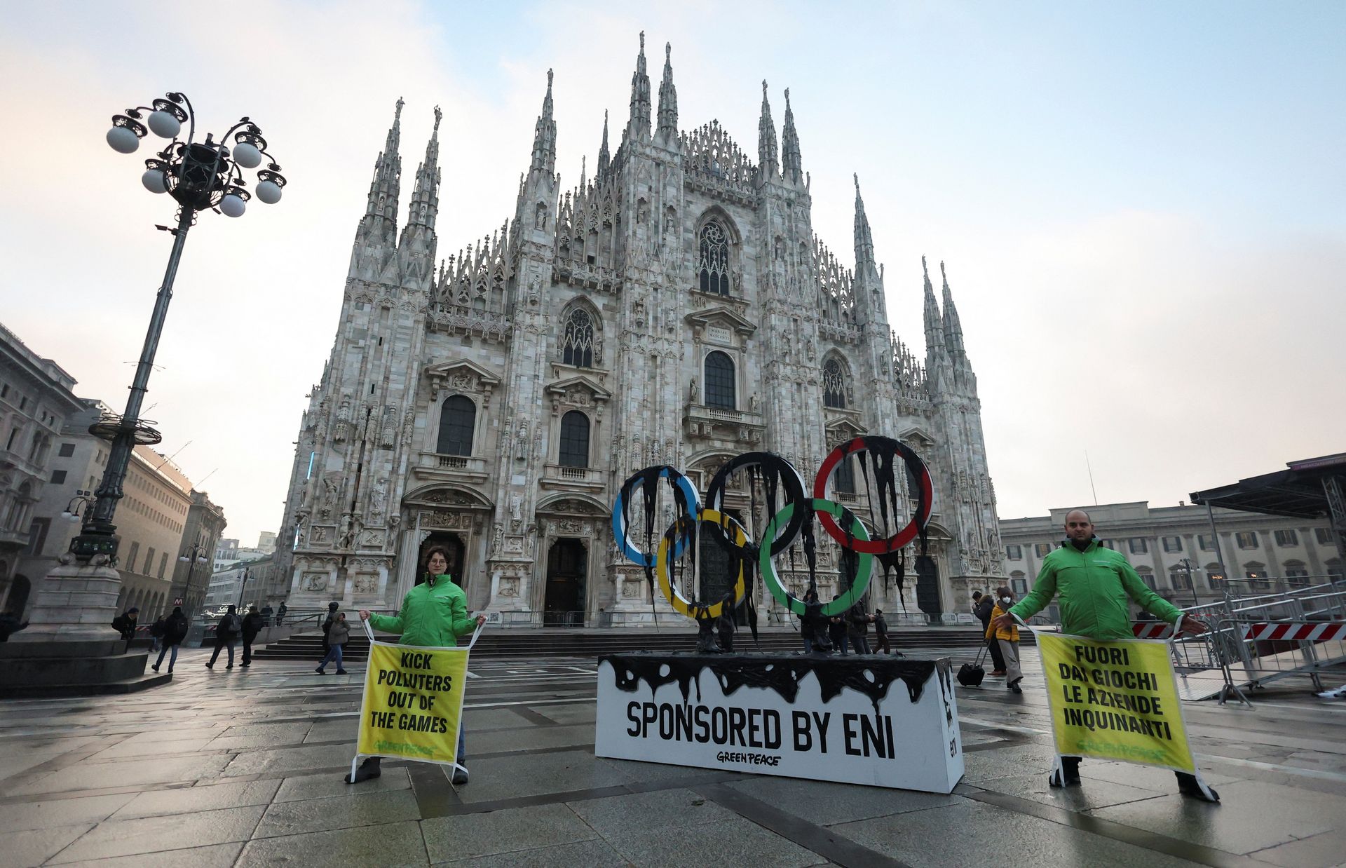 | Ativistas do Greenpeace protestaram hoje em Milão contra o patrocínio dos Jogos Olímpicos de Milão-Cortina 2026 pela gigante petrolífera Eni. Eles afirmam que as emissões de combustíveis fósseis causam mudanças climáticas que ameaçam os esportes de inverno. (Imagem: Reuters) |